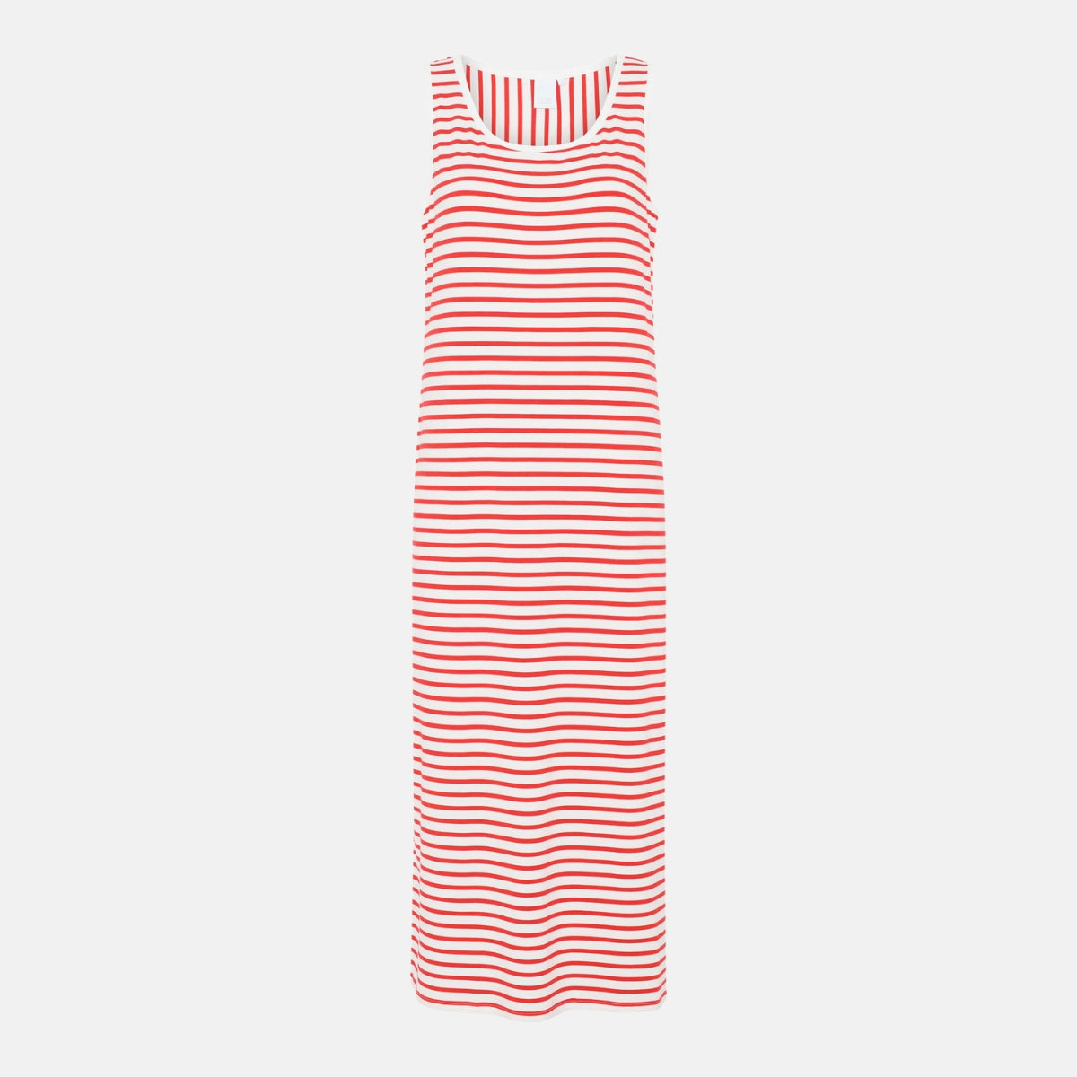 Anna bambus kjole fra CCDK har brede stropper, rund hals og en god længde. Kjolen har et enkelt udtryk med rød og hvide striber.