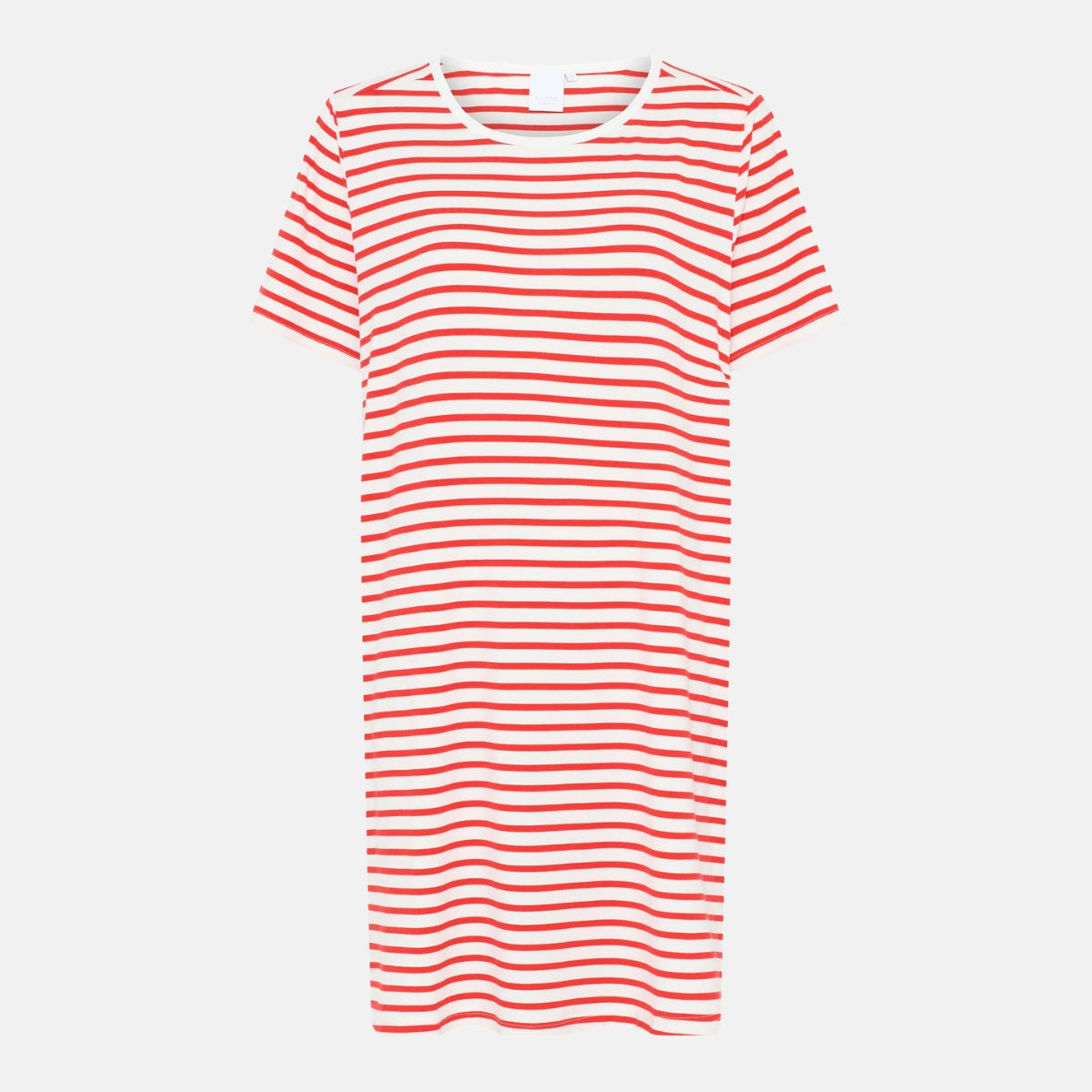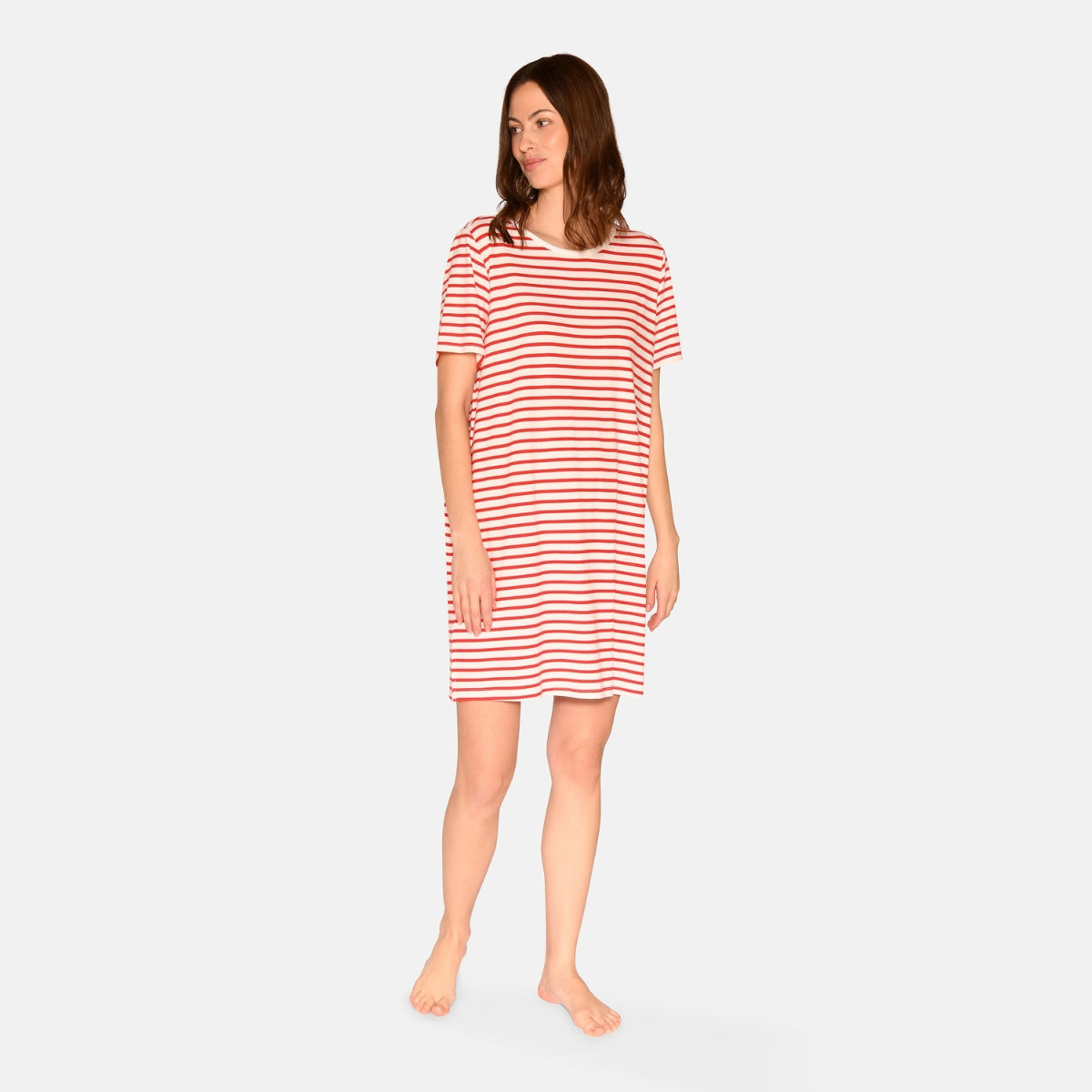 Bea kortærmet bambus natkjole i rød stribet design er blød, let og behagelig. Det åndbare bambusmateriale giver høj komfort og en afslappet pasform, perfekt til en rolig og behagelig nats søvn.